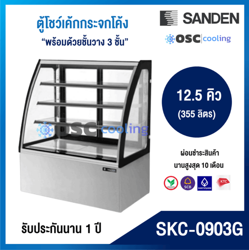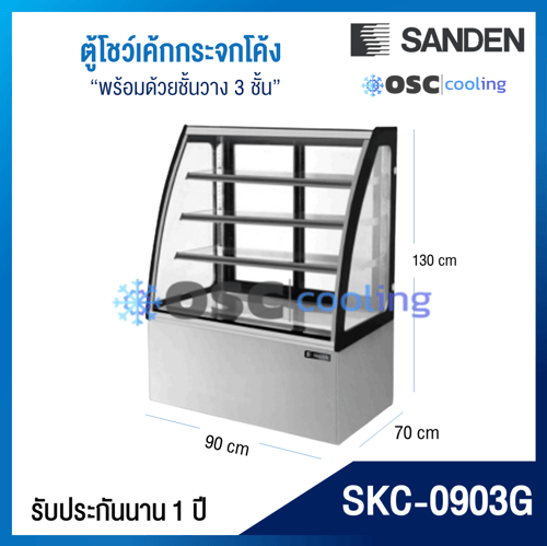 ตู้โชว์เค้กกระจกโค้ง 3 ชั้นวาง กว้าง 90 ซม. สีสแตนเลส "SANDEN" 12.5 คิว [SKC-0903G]